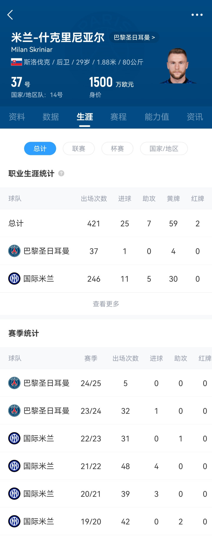 29岁的斯洛伐克中卫什克里尼亚尔,2023年夏窗自由身离开国米,免签加盟巴黎圣日耳曼。本赛季什克遭到主帅恩里克弃用,仅代表球队出战5场比赛,目前什克的德转身价为1500万欧元。